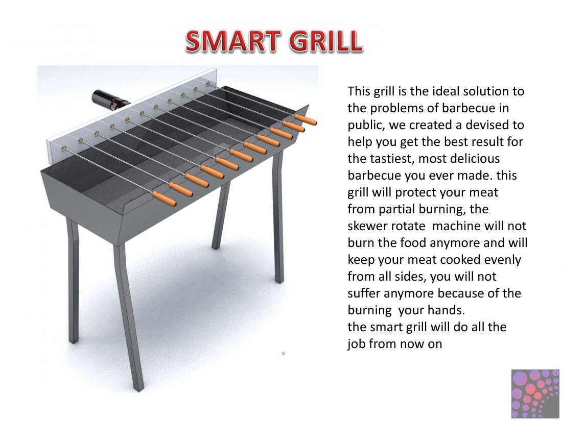 Since People have discovered to use fire to grill meat and vegetables in order to get a better result and delicious taste, there were many ways to barbecue. But it is still very ordinary way and have not been developed yet. From here we have invented a new way to grill and make it easy for all by using the (Smart Grill)